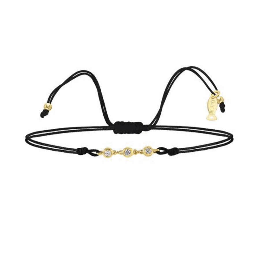 Bracciale con laccetto nero doppio con nodo scorrevole per aggiustare la misura. Ciondoli in oro giallo 14kt e zirconi bianchi da 2mm