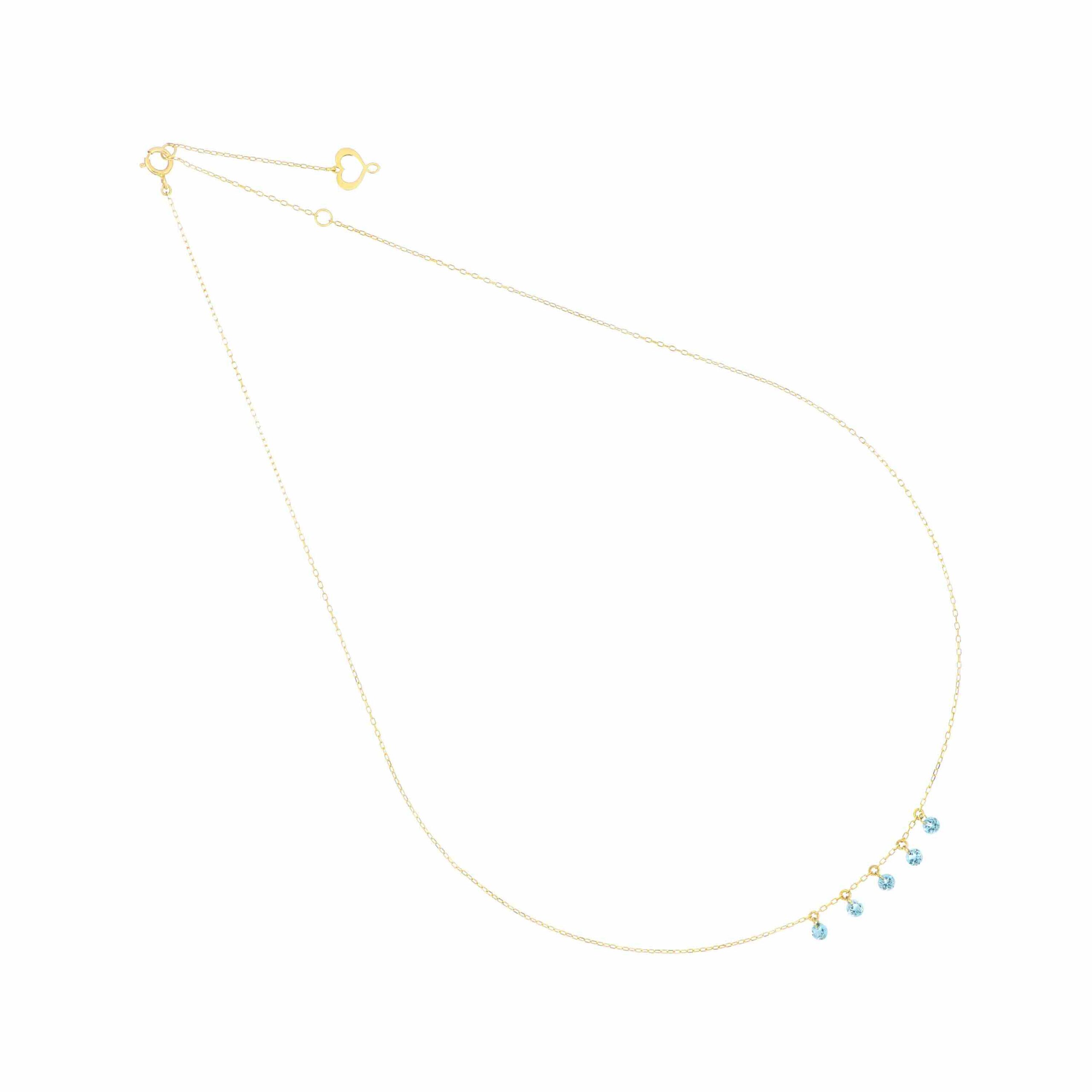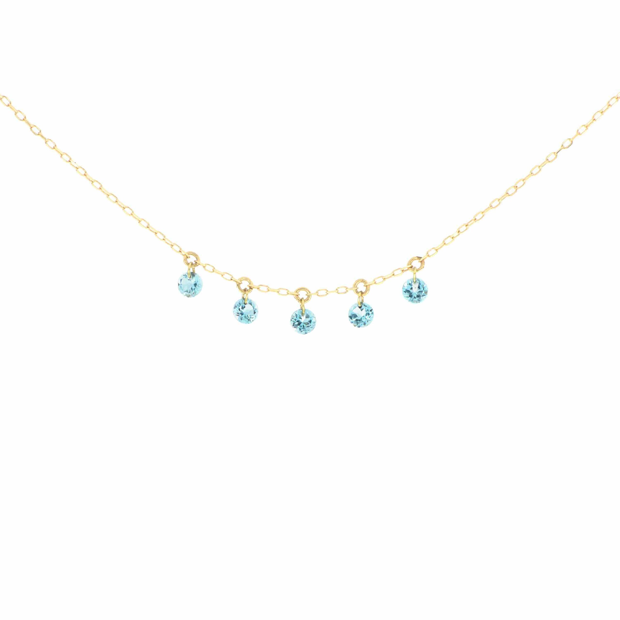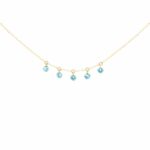 Il girocollo presenta cinque pietre di Topazio Azzurro pendenti sospese nel vuoto.