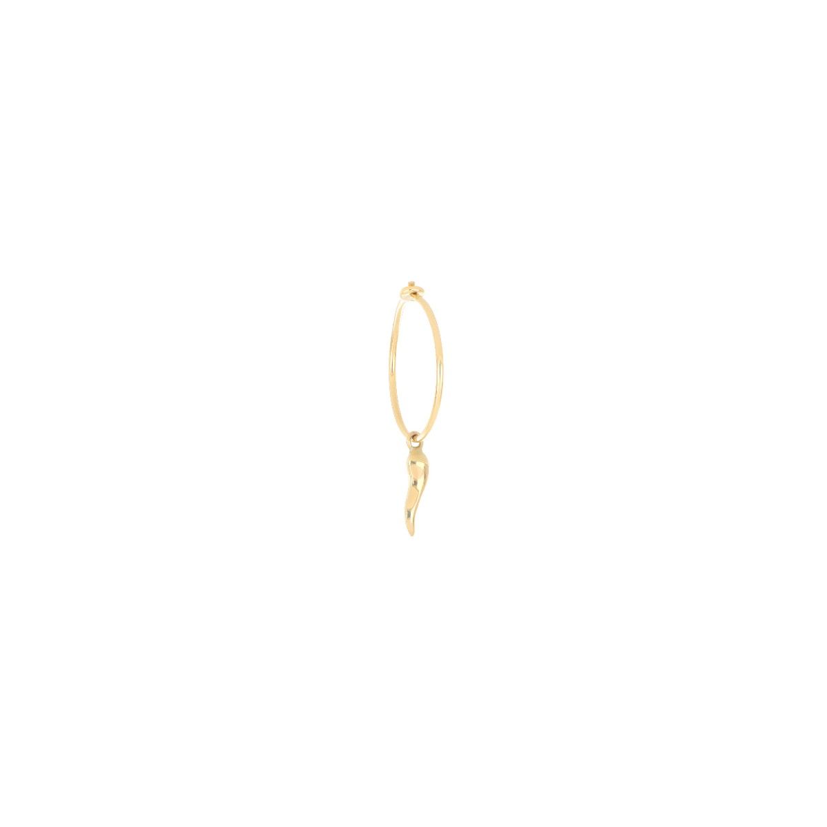 Orecchino a cerchio mini singolo in oro giallo 18 carati con cornetto pendente di lunghezza 1cm.
