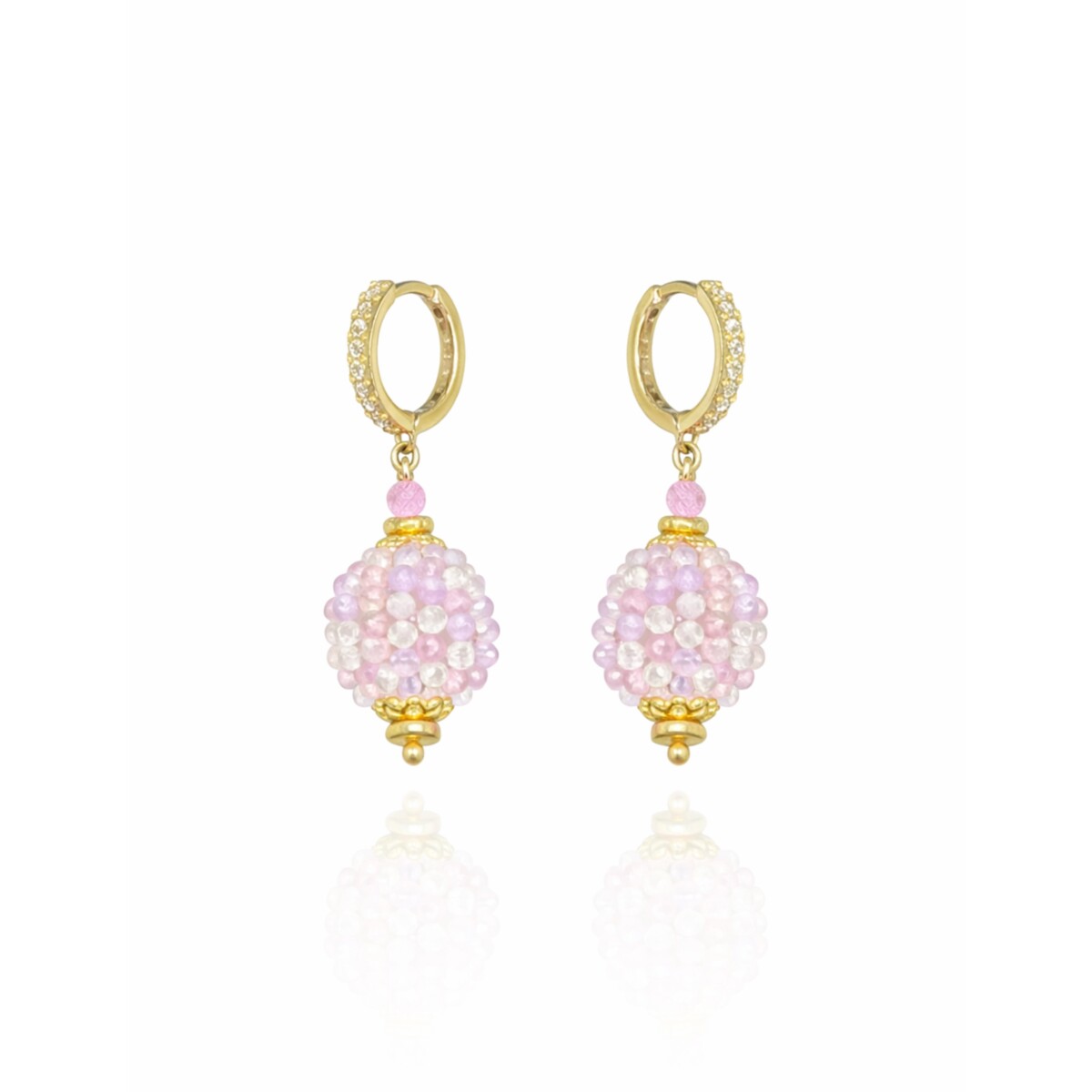 Orecchini con cerchietto e zirconi bianchi con pendente rotondo di zirconi multicolor lilla